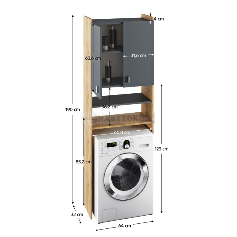 | Rozmery | ŠxVxH: 64x190x30 cm, otvor pre práčku: 60x85 cm |